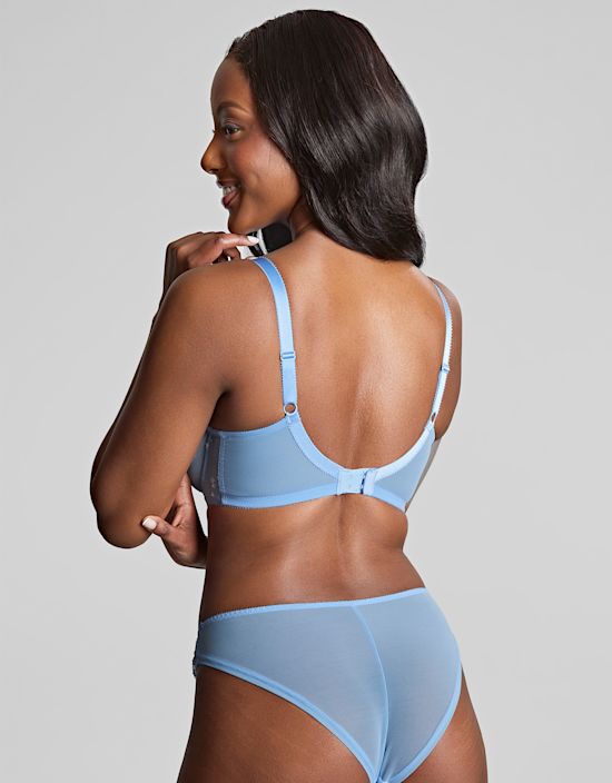 Very comfortable bra. Delicate blue with beautiful embroidered flowers. I find it points more forward than other bras I own but I absolutely love it. Works perfectly under dresses and non-fitted clothes. Looks great!